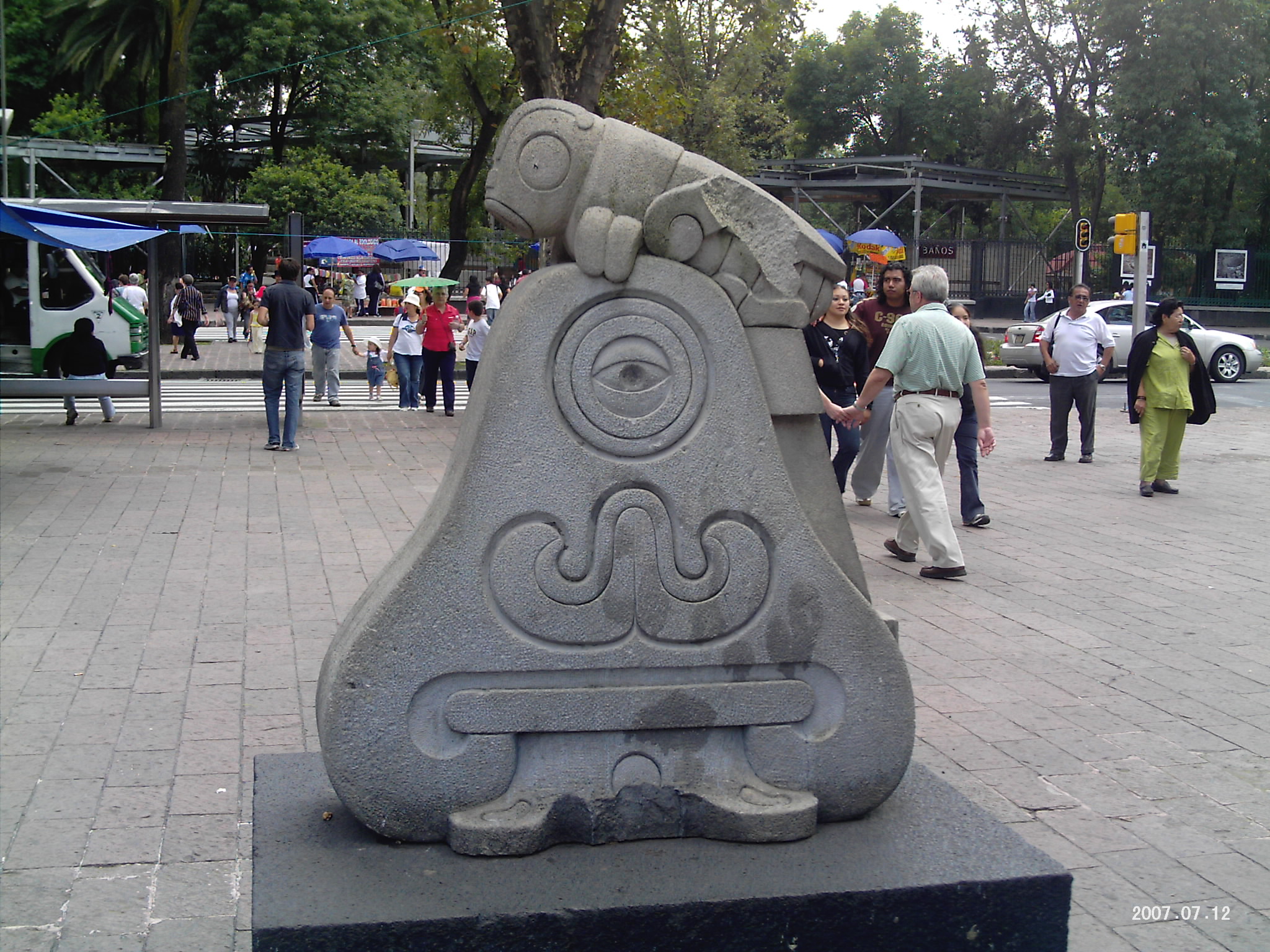 Xochipilli (1) was considered one of the more benevolent of the Mesoamerican deities and he was popular amongst the chinampa dwellers to the south of Tenochtitlan. This statue was excavated near Tlalmanalco (2) in the shadow of the volcano Iztaccihuatl (3) and has been registered as part of the collection of the National Museum of Anthropology since 1882. Sacrifices to him generally consisted of garlands of flowers and butterflies and the consumption of much pulque. There is not a great deal of information to be found about this god and there is some suggestion that the mask that his statue appears to be wearing may in fact be the flayed skin of a sacrificial victim.