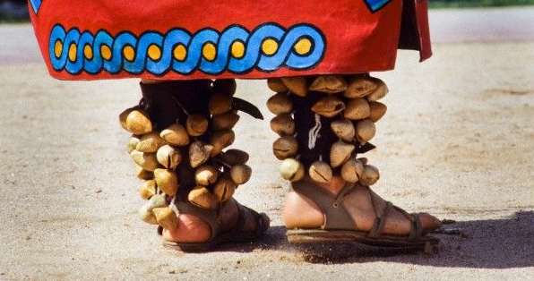 This rattle is made from ayoyotes or the seeds of the cachayote (chachayotl) tree (1) and can be commonly seen these days adorning the ankles of the conchero dancers (2) which can be found performing daily in the Zocalo (and many other places) of Mexico City.