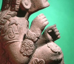 Xochipilli was a god of vegetation and rebirth and this may explain why the statue above appears to be wearing a mask. Masks are a common theme in Aztec culture and played a part in ritual and religious ceremony. They were transformational objects believed to have great power and could open portals from one identity or reality to another. Flayed skins taken from sacrificial victims also played transformational roles and the wearing of them and later shedding of them were relevant in ceremonies symbolising rebirth. Justíno Fernández in his work “Una aproximación a Xochipilli” (1959) has no doubt that the figure was not only masked but that the mask was likely inlaid with precious materials long since removed. There has been mention that Xochipillis eyes as they are on the statue are indicative of “hugely dilated pupils” as one might exhibit if they were intoxicated by something hallucinogenic.