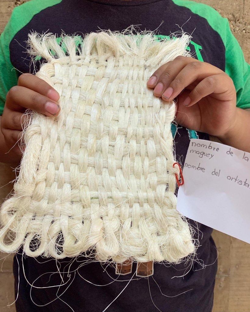 In Oaxaca Duub Ixtle has partnered with Hermano Maguey (1) to present a multi-day course developed to teach youth in Indigenous communities about regenerative design practices, with a goal of reviving the use of ixtle. In this multi-day course, children are gifted a maguey (agave) plant to care for. They observe and draw their maguey, using Zapotec, Spanish, and English to create a written description of the plant and its properties. They are then given raw ixtle fibre which they wash and then use to prepare an original woven textile.