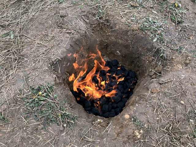 Build your fire in the pit and allow it to burn down to coals. While the fire is burning char your agave pencas over the flame to make them limp and flexible. The pencas must first be shaved at the base so they are of even thickness and pliability. Once the fire has burned down you can line the sides of the pit with the pencas overlapping them and laying the tops back on the surface of the ground. You may want to hold the tops down with stones while you finish the pit.