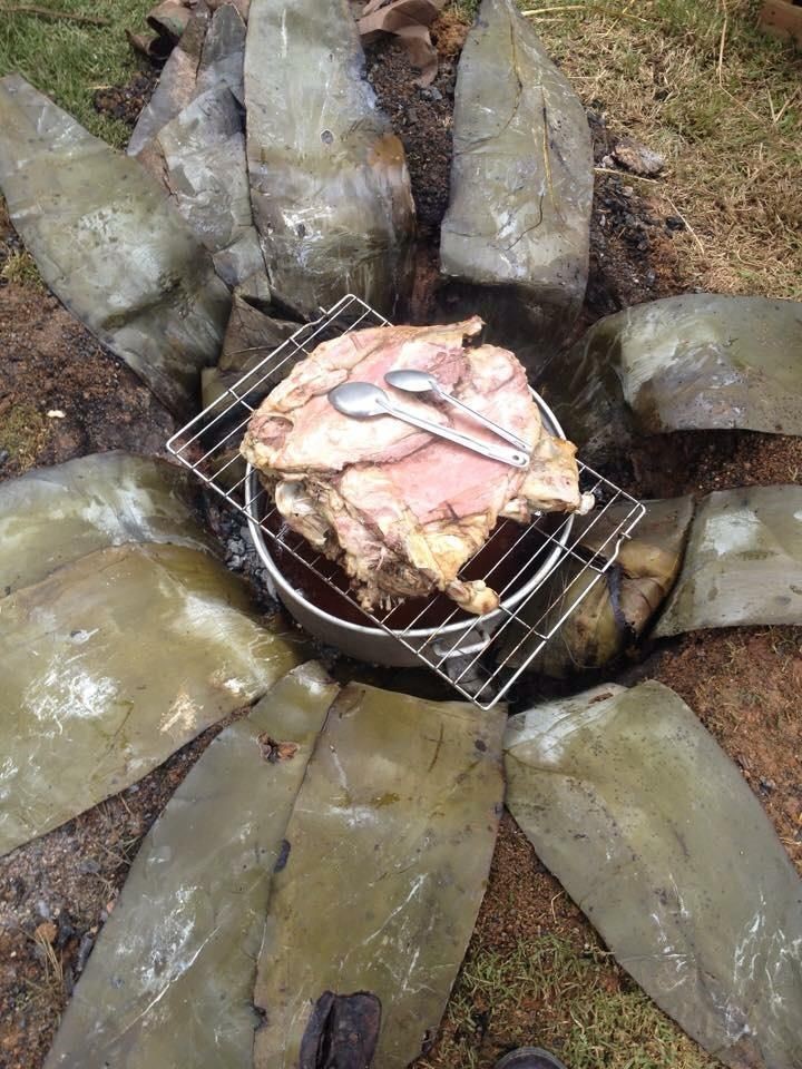 Once cooked carefully uncover the meat so that you don’t get any dirt into it and eat away. The juices which have collected in the pot are eaten as a kind of soup or they can be added back to the chopped cooked meat for extra flavour.