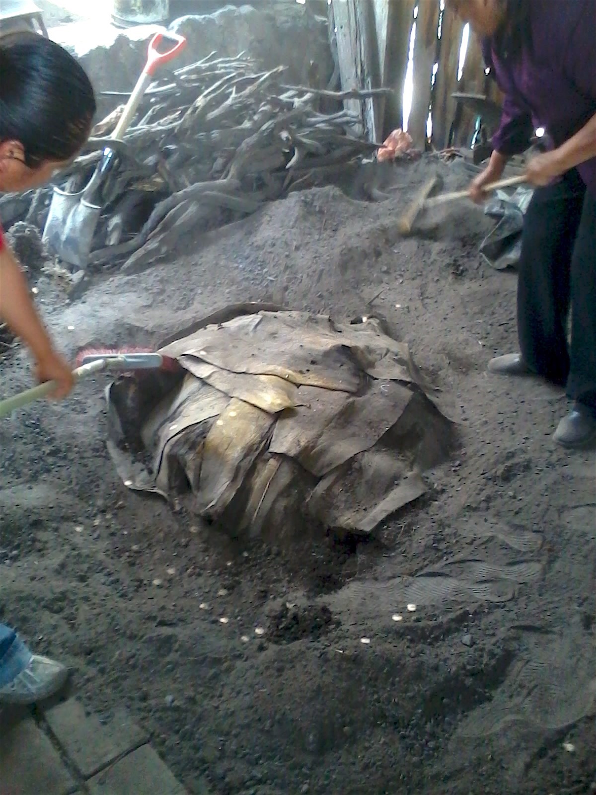 Fold the pencas over the meat and cover with a tray or board. If you don’t have agave pencas then you could use banana leaves to cover the food. This will also add a little flavour (as anyone who has eaten food cooked in banana leaves will know). Lay more leaves over this and cover with a straw mat (the Aztecs used a mat called a petate). The leaves (and mat) will help the steam to build up and to prevent heat and smoke escaping.Cover all of this with earth and allow the meat to cook.