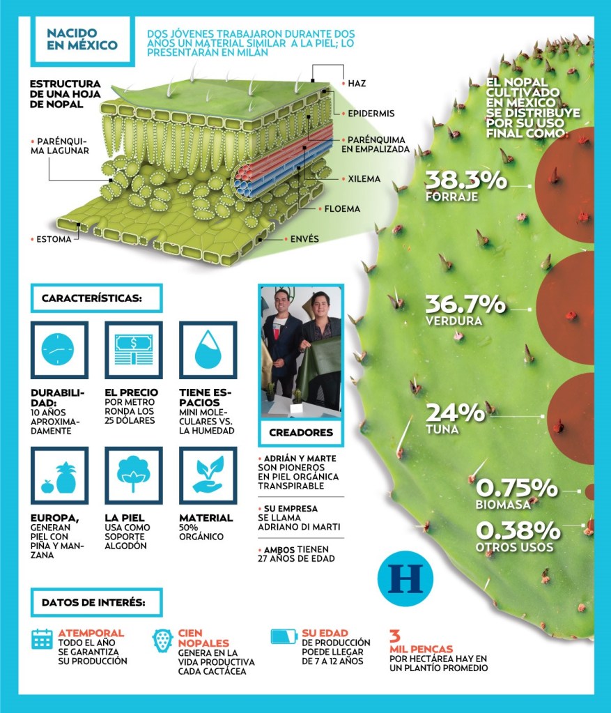 This October two inventors from Guadalajara in Mexico will travel to Milan in Italy to showcase a new product made from the nopal cactus at Lineapelle. Lineapelle is a prestigious international trade exhibition of leather goods which is held twice a year and exhibits “New trends in leather, textiles and synthetics for shoes, handbags, leather goods and leatherwear”. In the upcoming October fair Adrián López and Marte Cazárez will present a new innovation in eco-friendly leather which uses the Opuntia cactus as its base material.