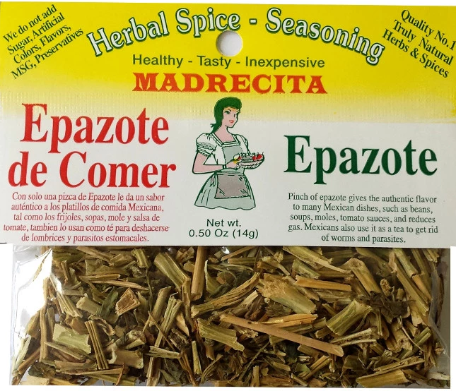 Its leaves (fresh or dried) and young shoots are used as a seasoning in Mexican, Chilean and other South American dishes. In México a sprig of the fresh herb is added to the bean cooking pot and removed before service. It is believed that epazote is a carminative and will reduce the propensity for beans to cause flatulence.