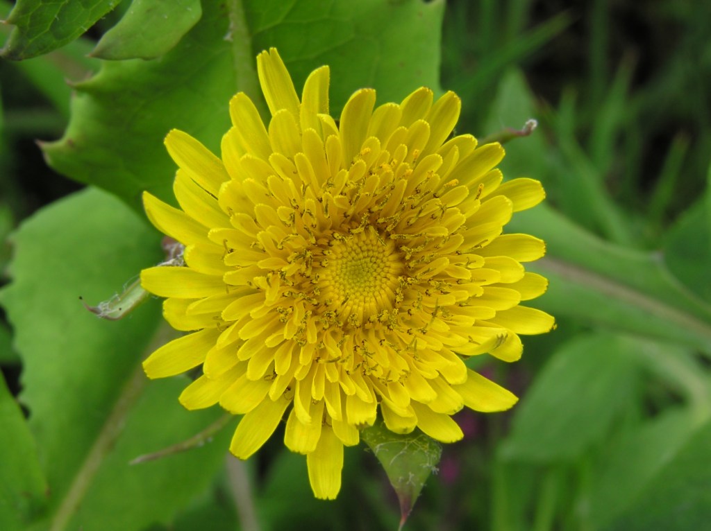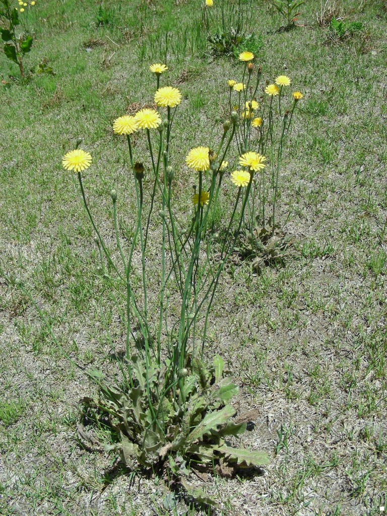 - Dandelions (Taraxacum officinale) also have a hollow stem that exudes a white latex when cut but the stem (or more properly, the peduncle or flower stalk) is circular in cross-section. The stems of the sowthistle are angular in cross-section. Another herb often confused with dandelions is called Catsear (Hypochaeris radicata). This plant also exudes a white latex when cut and its stem too is circular in cross-section but it is solid. All three plants have similar yellow flowers (although dandelions have 1 stalk per plant and 1 flower per stalk while catsear and sowthistle both can have multiple stalks and flowers per plant), all have similar leaf structure and all have similar fluffy seed heads. The leaves of all three plants are edible while young but become more bitter as they get older and larger and when they flower.