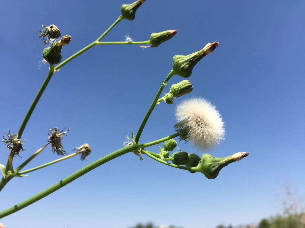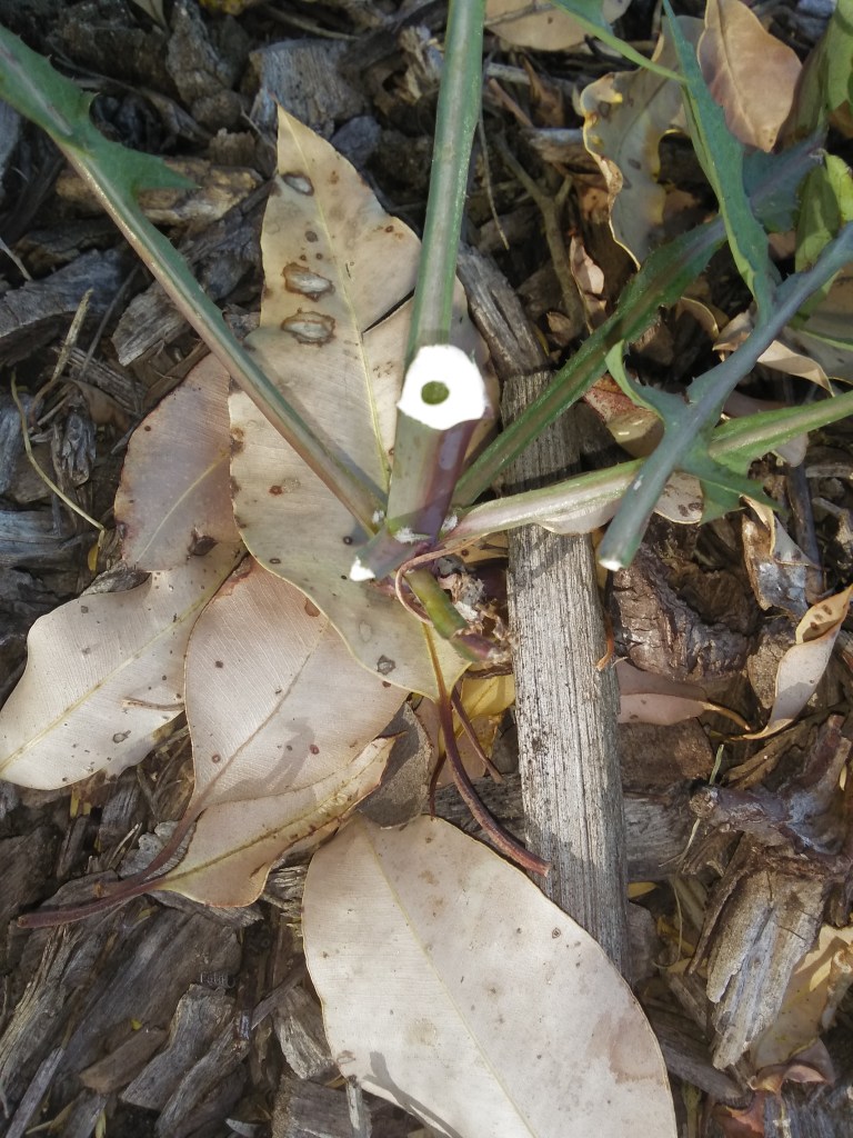 The plant has hollow angular stems which exude a milky latex when cut (1). The name “sonchus” is derived from a Greek word (sónkhos) meaning “hollow” which alludes to the hollow succulent stems of this plant.