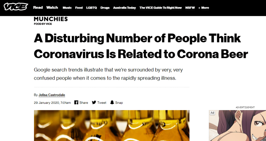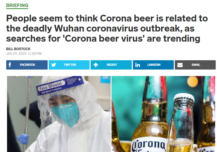 Constellation Brands (the conglomerate behind Corona, the beer not the virus) put out a statement that “recent misinformation about the impact of this virus on our business has been circulating in traditional and social media without further investigation or validation. These claims simply do not reflect our business performance and consumer sentiment” and that the sales of Corona Extra in the period ending Feb 16th 2020 “remain strong, with dollar sales up 5% in the U.S.”. They continued by saying “We’ve seen no impact to our people, facilities or operations and our business continues to perform very well.”