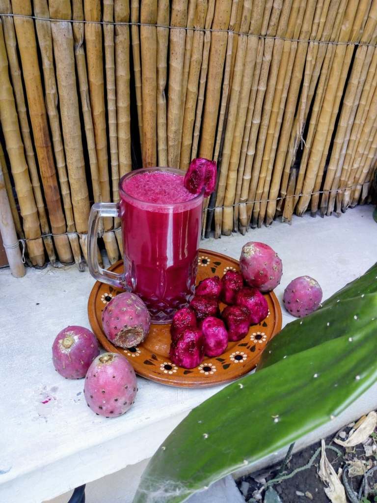 He notes of sangre de conejo that although its popularity rises he fears that specific knowledge is being forgotten and the old ways are being lost. The first of this is that the incorrect cactus fruit (tuna) is generally used. He states “ One of the first misunderstandings that neophytes have in front of the wild tuna is to confuse it with the xoconochtli or xoconochtle or xoconostle, the “sour prickly pear” (tuna agria) of the Aztecs”(1). The proper variety to be used he says is the variety known tuna cardona (2). This is a “wild” variety of prickly pear (3) which has a limited range and short fruiting season. This may be one of the reasons the xoconostle is being used instead of the cardona, it is simply more widely available for a longer period of time. Give me convenience or give me death (4). The flesh of the two fruits are quite similar to each other although the xoconostle is more sour in flavour and has few (if any) spines on the fruit (and their fruits tend to be larger than that of the cimarrona/cardona). The cardona has an “army” of tiny thorns that are the bane of unknowing campers and wildcrafters who may harvest the fruits “as if they were peaches” and then find themselves to be a human pincushion.