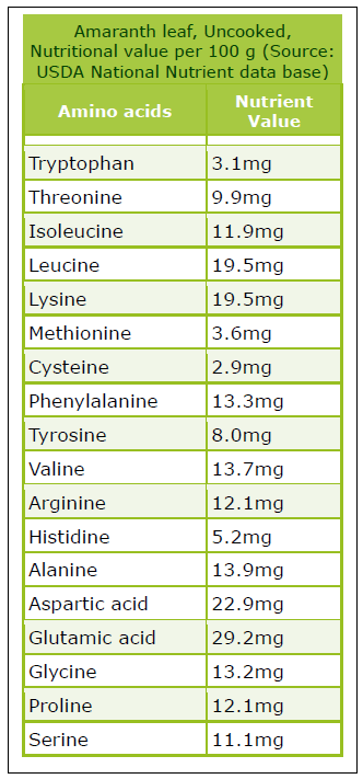 Amaranth seed is an excellent source of proteins and has more protein than corn. It is also quite high in the limiting amino acid (1) lysine. Lysine is a limiting amino acid in cereals like corn (maize), rice and wheat. Amaranth also contains the sulphur rich amino acids (2) which are normally absent in pulses (3). The seed is also quite high in oil content when compared to other grains. They consist of approximately 6-10% oil content of which about 77% are polyunsaturated fatty acids and is particularly high in linoleic acid.