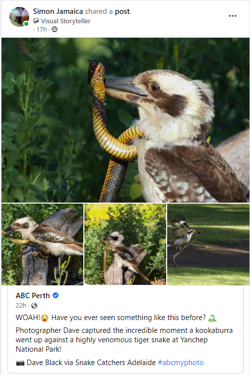 In Yanchep National Park (1) a photographer has captured a highly venomous and aggressive (if cornered) local snake called a Tiger snake. These snakes are so named because of the striped yellow and black colouration that is typical to snakes of this species (although some can be totally pitch black).