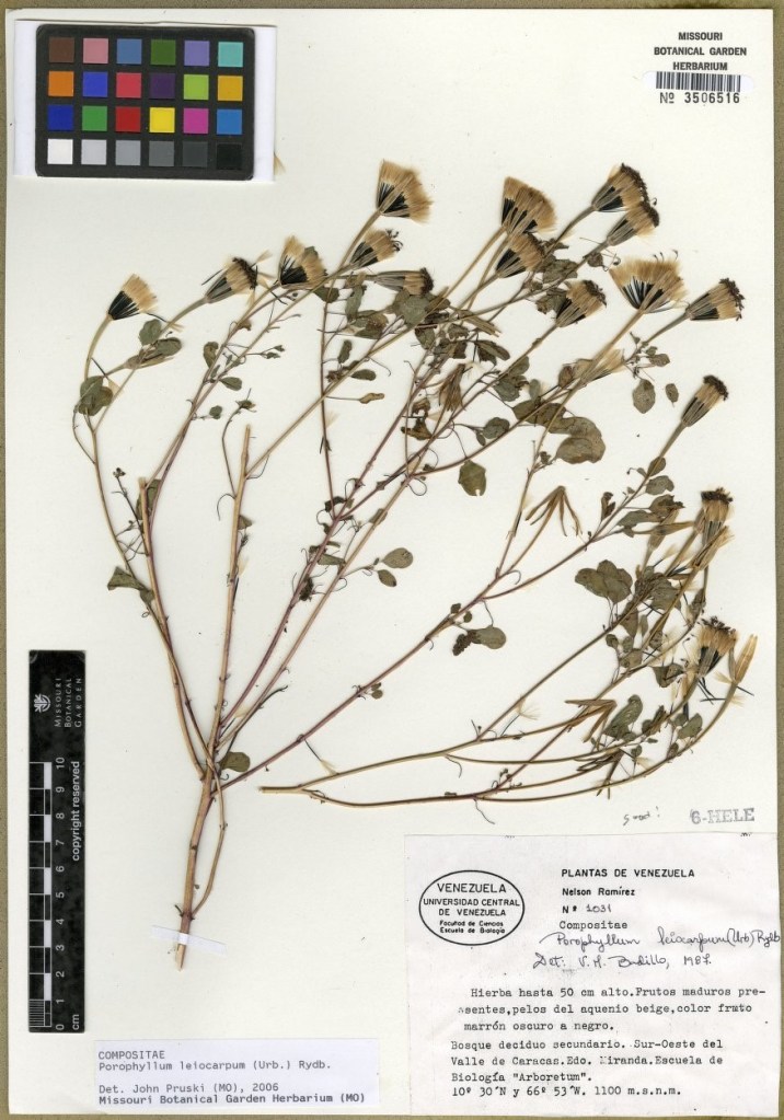 Porophyllum leiocarpum was originally described as a variety of P.macrocephalum but was elevated to specific status by Rydberg and has been treated as such by subsequent authors (Hansen 2012).