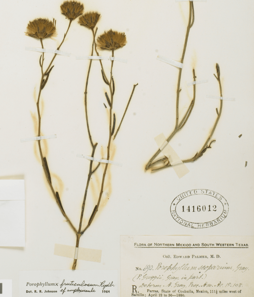 Porophyllum X fruticulosum Rydb. was first proposed in 1916 as a species, typified by a specimen collected by Palmer near Saltillo, Mexico. The species was subsequently treated as a natural hybrid between the relatively localized P. amplexicaule and the more abundant and widespread P. scoparium