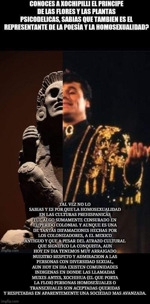 “In the last days a video circulates that the Xochipilli deity is associated with homosexuality among the Mexicans, we need to clarify that here in Resistencia Tenochtitlán we have nothing against homosexuality, but if it is our responsibility to deny such hypothesis. It is known even that this kind of practice for Mexicans was not well seen and even punished with death. We cannot understand the concept of Xochipilli if we see and judge the past with the eyes of the present.“ (Authors emphasis)