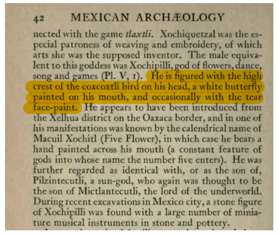 Several days later, through a spot of Universal synchronicity, I came across this reference to Xochipilli’s headdress being modelled after the crest of a bird known as the coxcoxtli.