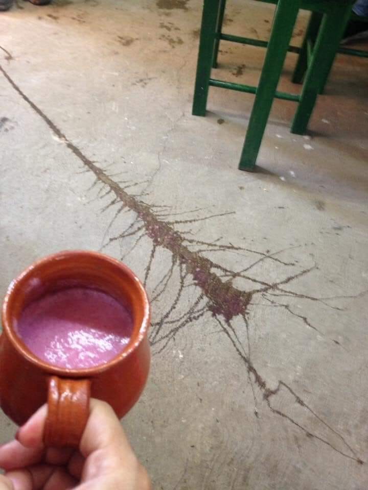 This is done after taking your first drink of pulque (and before purchasing your second) as a test of the quality of the pulque. For it to be a good pulque it must have the following qualities. The liquid must not be too transparent, nor too white; It must have a suitable baba (1) or viscosity, not so liquid, or too thick. Another way to test the quality of the pulque is to pour in some fresh aguamiel. The two should remain separated like oil and water in the glass.
