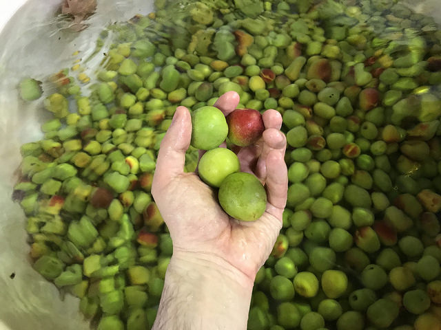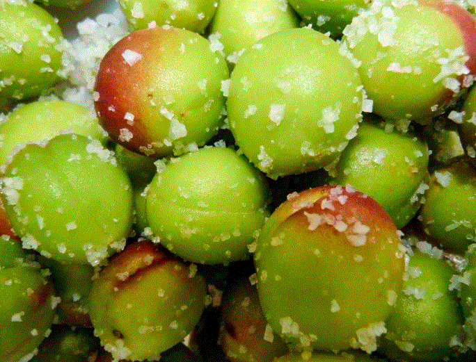 Umeboshi are traditionally made by harvesting ume fruit when they ripen and packing them in barrels with 20% salt per weight of fruit. The salt extracts juice, which the ume then soak in for about two weeks. This salty, sour liquid is sold as umezu (梅酢) which is often translated as ‘ume vinegar’.