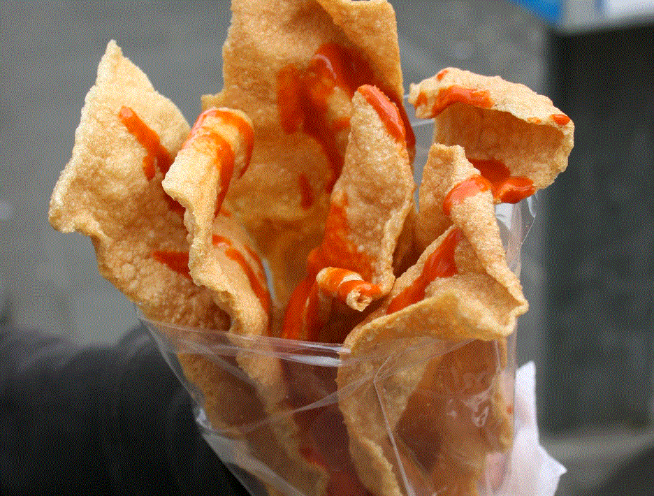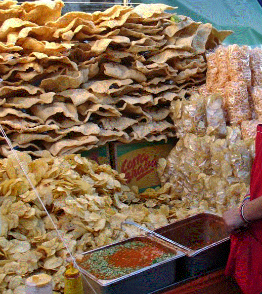 In México you will find chamoy used to spike bags of chicharron that you can buy from vendors in the mercados and on the streets (1). You can also find chicharrones de harina. These are snacks made from flour that puff up like pork rinds (2) when fried and offer a non-meat version of pork rinds.