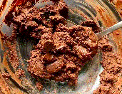 Sift together the flour, baking powder and cacao. Mix 1/3 of the flour mix into the butter chocolate mix. Stirring well to combine. Continue until all flour is combined