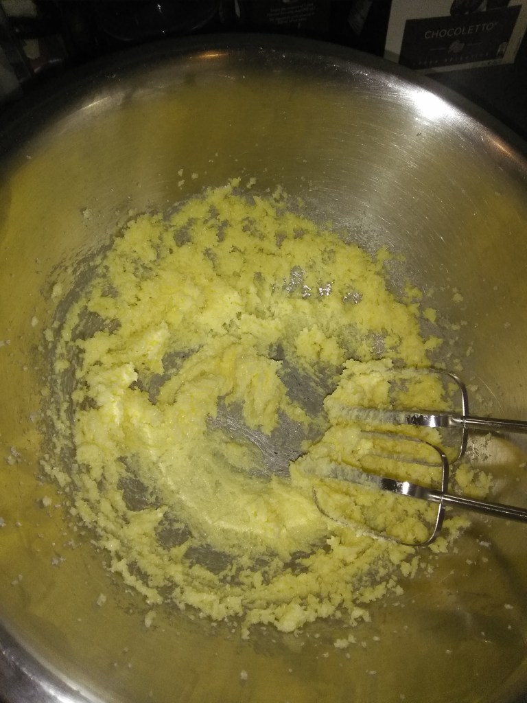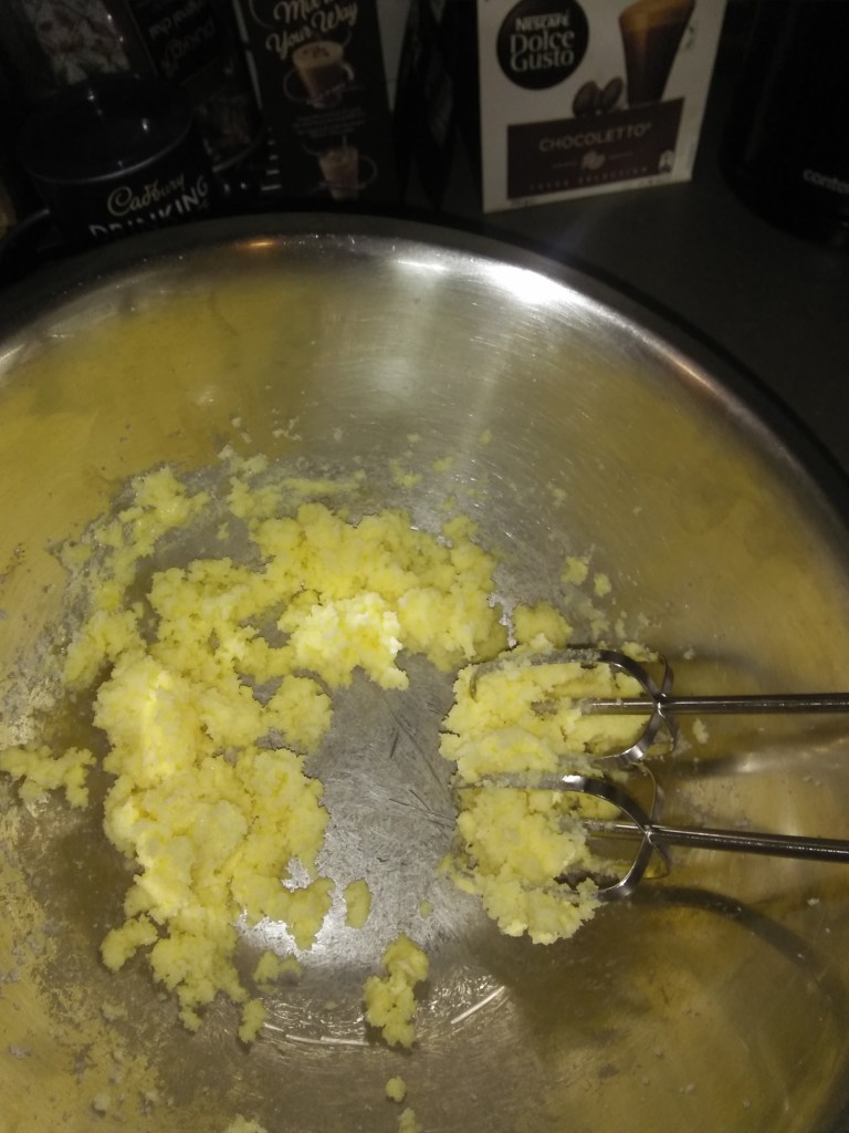 Start to mix on a higher speed. Note the colour of the butter – still quite yellow