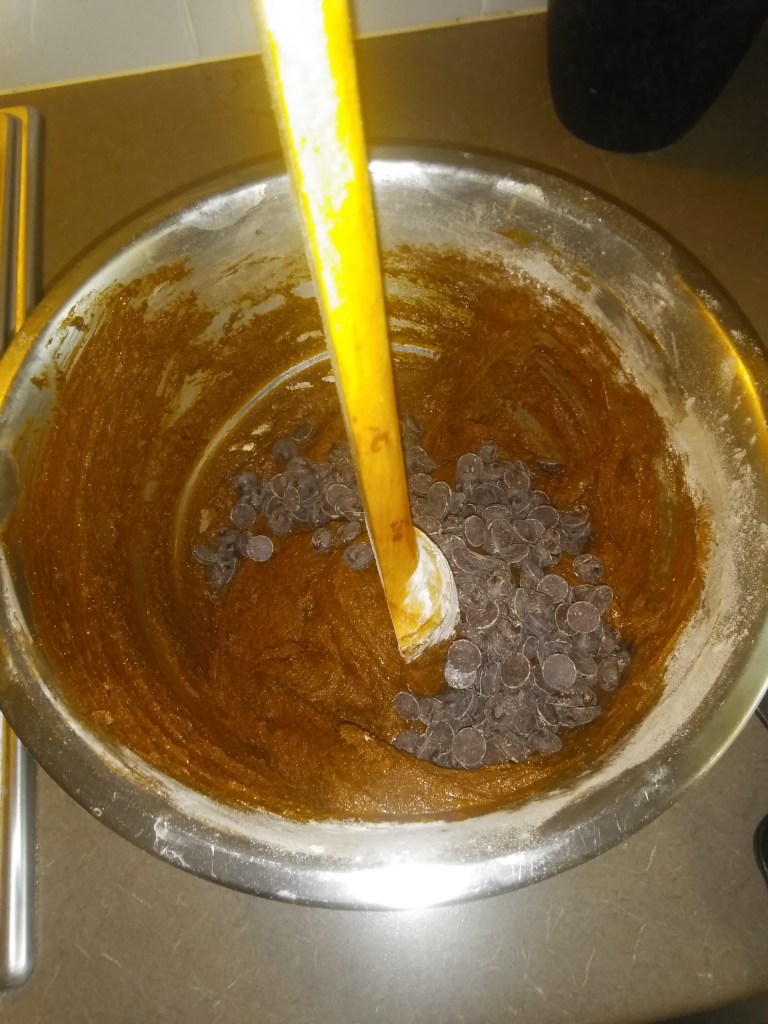 This is where things changed with the recipe. The original recipe called for me to transfer the mix into a piping bag, pipe the dough onto the baking tray like macarons and sprinkle the choc chips on top. The flour was very thirsty. It easily absorbed all the liquid called for in the recipe and as for piping it the dough was waaaay too stiff for this. I instead opted to mix the chips into the dough and proceed as for drop cookies.