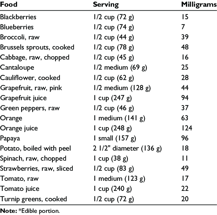 Comparing the two charts above for flor de jamaica and rosehips shows that the Vitamin C content of rosehips can be anywhere between 20 – 30 times that of the hibiscus calyxes; and comparing flor de jamaica with the chart below shows that the hibiscus calyxes have a similar Vitamin C content to that of a medium sized tomato (136g), 1/2 a cup (45g) of raw cabbage or 1/2 cup (72g) of blackberries.