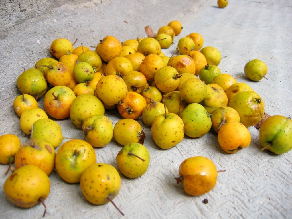 Tejocote : Crataegus mexicana is a species of hawthorn known by the common names tejocote, manzanita, tejocotera and Mexican hawthorn. It is native to the mountains of Mexico and parts of Guatemala, and has been introduced in the Andes. Tejocote, the Mexican name for this fruit, comes from the Nahuatl word texocotl which means “stone fruit”. The fruit is eaten in Mexico cooked, raw, or canned. It resembles a crabapple, but it has three (or sometimes more) brown hard stones in the centre. It is a main ingredient used in ponche, the traditional Mexican hot fruit punch that is served at Christmas time and on New Year’s Eve.