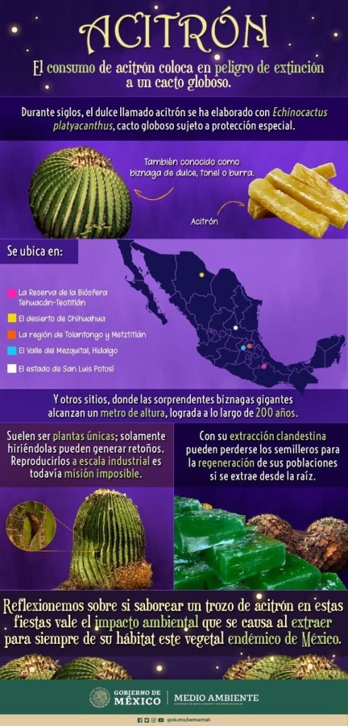 The biznaga is a source of different culinary products, but it is most widely used in confectionery, using its pulp known as citron (or acitron). This product is a fibrous and firm jam that is juicy and sweet, much appreciated and used in traditional Mexican cuisine. Small pieces of the cactus stem flesh are boiled in water with large amounts of sugar. They are air dried to allow the sugar to crystallize, producing attractive candies. These Biznaga sweets are still found produced on a small scale under specialized domestic conditions, but industrial producers have also capitalized on this sweet. The citron is an ingredient that has been part of many dishes throughout history since the introduction of the “rosca de reyes” and “chile en nogada.” The popularity of the cactus, particularly for industrial-scale uses, combined with its slow rate of growth, means that the biznaga de Tehuacán has become a highly threatened species. Recently, harvest of the cactus has been made illegal, negatively affecting the ingigenous populations that would harvest the cactus on a small scale for personal and community use. It is used in Otomies and the neighbouring municipality of Cardonal, Hidalgo as food and forage. There still exists a relatively large-scale illegal trade of the citron cactus pulp in Mexico, which is not allowing the biznaga populations to recover. Only the harvest is deemed illegal, technically not the sale of the biznaga products or derivatives, and so it is especially found in markets in the holiday seasons when it is used to prepare traditional dishes. https://www.fondazioneslowfood.com/en/ark-of-taste-slow-food/biznaga-de-tehuacan-cactus/