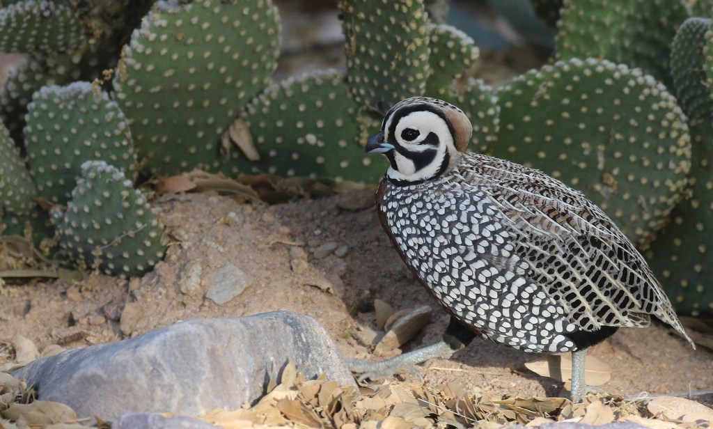 Cordoniz de Moctezuma : Cyrtonyx montezumae. The species is distributed in highlands from south-eastern Arizona , southwestern and central New Mexico and west Texas to Mexico, from the border states (from Sonora to Tamaulipas ) south to Oaxaca (west of the Isthmus of Tehuantepec ). It is also known as the Mearns quail , the harlequin quail (for the male’s striking pattern), and the dumb quail (for its behaviour). In the presence of humans, the Mexican harlequin quail, instead of running, stays crouched and without moving, hidden among tall grasses. They can tolerate an approach of up to 1 m before fleeing, and have sometimes been caught by hand.
