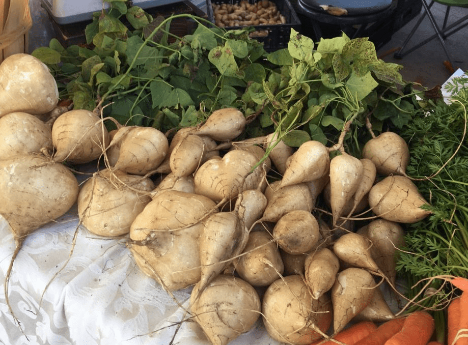 Jicama : Pachyrhizus erosus, commonly known as jícama); from Nahuatl xīcamatl, Mexican yam bean, or Mexican turnip, is the name of a native Mexican vine, although the name most commonly refers to the plant’s edible tuberous root. The root’s exterior is yellow and papery, while its inside is creamy white with a crisp texture that resembles raw potato or pear. The flavour is sweet and starchy, reminiscent of some apples or raw green beans, and it is usually eaten raw, sometimes with salt, lemon, or lime juice and chili powder. It is also cooked in soups and stir-fried dishes.