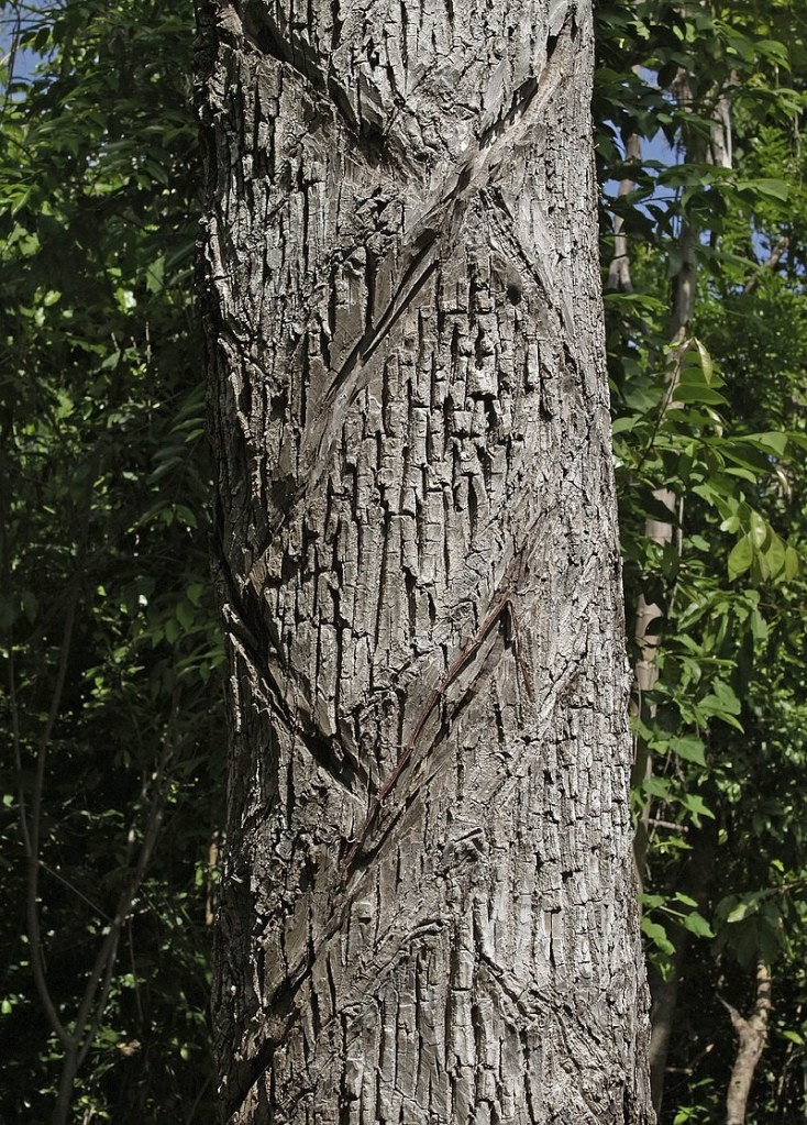 Manilkara zapota, corteza con incisiones. Árbol del chicle. Jardín Botánico «Dr. Alfredo Barrera Marín». Puerto Morelos, Quintana Roo, México.