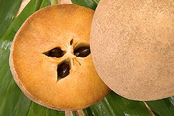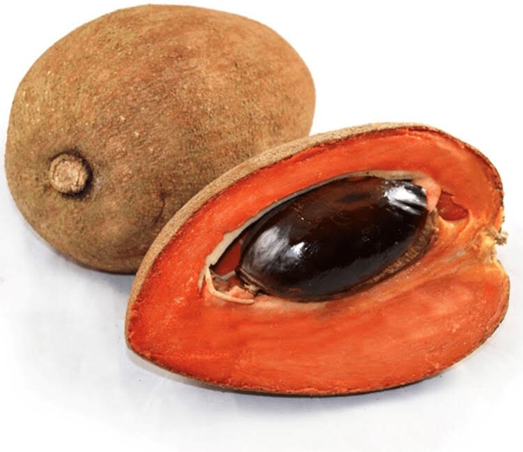 Also called chicozapote : Manilkara zapota, commonly known as sapodilla is a long-lived, evergreen tree native to southern Mexico, Central America and the Caribbean. The fruit is a large berry, 4–8 cm (2–3 in) in diameter.[5][6] Inside, its flesh ranges from a pale yellow to an earthy brown colour with a grainy texture akin to that of a well-ripened pear. Each fruit contains one to six seeds. The seeds are hard, glossy, and black, resembling beans, with a hook at one end that can catch in the throat if swallowed. The fruit has an exceptionally sweet, malty flavor. The unripe fruit is hard to the touch and contains high amounts of saponin, which has astringent properties similar to tannin, drying out the mouth.
