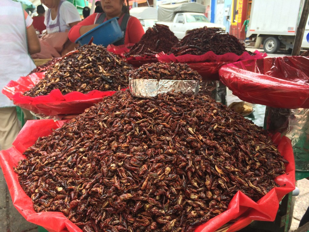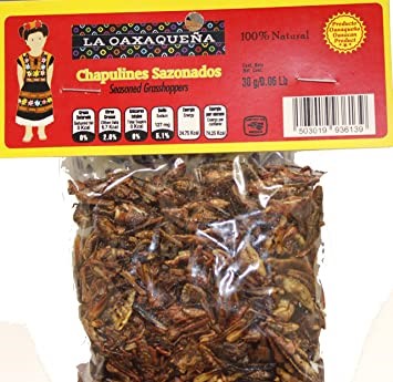 Chapulines : Chapulines, plural for chapulín are grasshoppers of the genus Sphenarium that are commonly eaten in certain areas of Mexico. The term is specific to Mexico and Central America, and derives from the Nahuatl word chapolin (singular) or chapolimeh (plural). They are collected only at certain times of year (from their hatching in early May through the late summer/early autumn). They are toasted on a comal. Often they are seasoned with garlic, lime juice and salt, sometimes with an extract of Maguey worms, lending a sour-spicy-salty taste to the finished product. One of the regions of Mexico where chapulines are most widely consumed is Oaxaca, where they are sold as snacks at local sports events and are becoming revived among foodies
