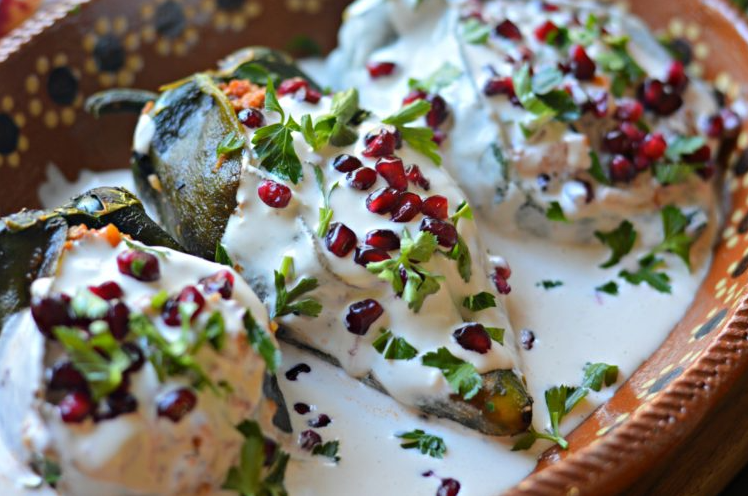 Chiles en Nogada is a dish comprised of my favourite fresh chile, the poblano, which has been stuffed. The stuffed chile is then bathed in a walnut sauce and garnished with pomegranate seeds, and fresh parsley. The garnishes represent each colour on the Mexican flag (2), as the dish commemorates Mexican Independence.