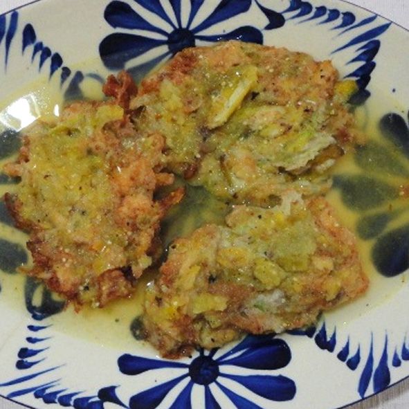 - Dredge the tortitas in flour and remove any excess flour. Fry the tortitas in hot oil and drain to remove excess oil.