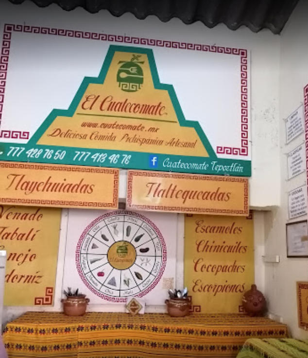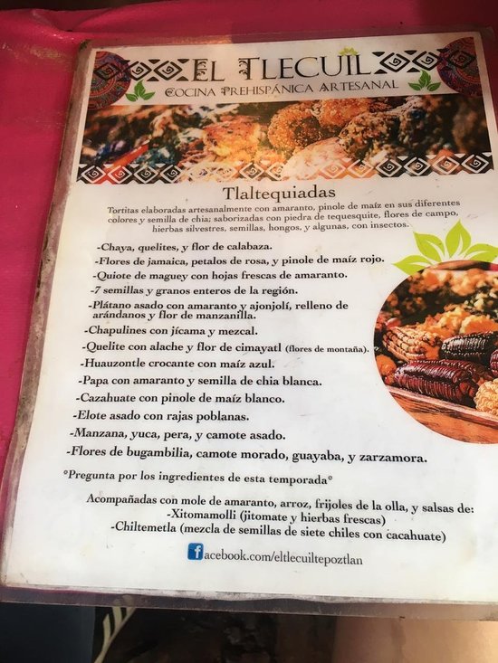 El Tlecuil is another proponent of artisanal prehispanic cuisine. They do not use eggs, dairy or lard (in their vegetarian cookery)(1). A short list of ingredients you might find in their food includes such things as, nopal, alache (2), quelites (3), pinole, insects (4), wild flowers (5), amaranth seed, guajes (6), chilacayote, jicama, agave flowers, epazote (7), local mushrooms, tequesquite water (used to reinforce flavours) (8) and of course the ubiquitous Mexican ingredient the chile. They are known for their tlaltequiadas , which are served with black beans, rice, hand made tortillas (and perhaps some mole if you like that sort of thing). “After trying them, you will never enter a McDonald’s again“, is how they are advertised on their Facebook page (9).