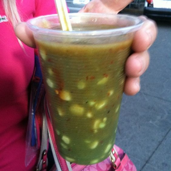 - In Uruapan it is prepared with fresh corn ground with green chili, anisillo and pumpkin leaves or guias (squash vines/tendrils), resulting in a green drink. It is sold and drunk mainly during Holy Week. It also contains whole corn kernels; its flavour is salty and it is usually served with finely chopped perones or serrano peppers.