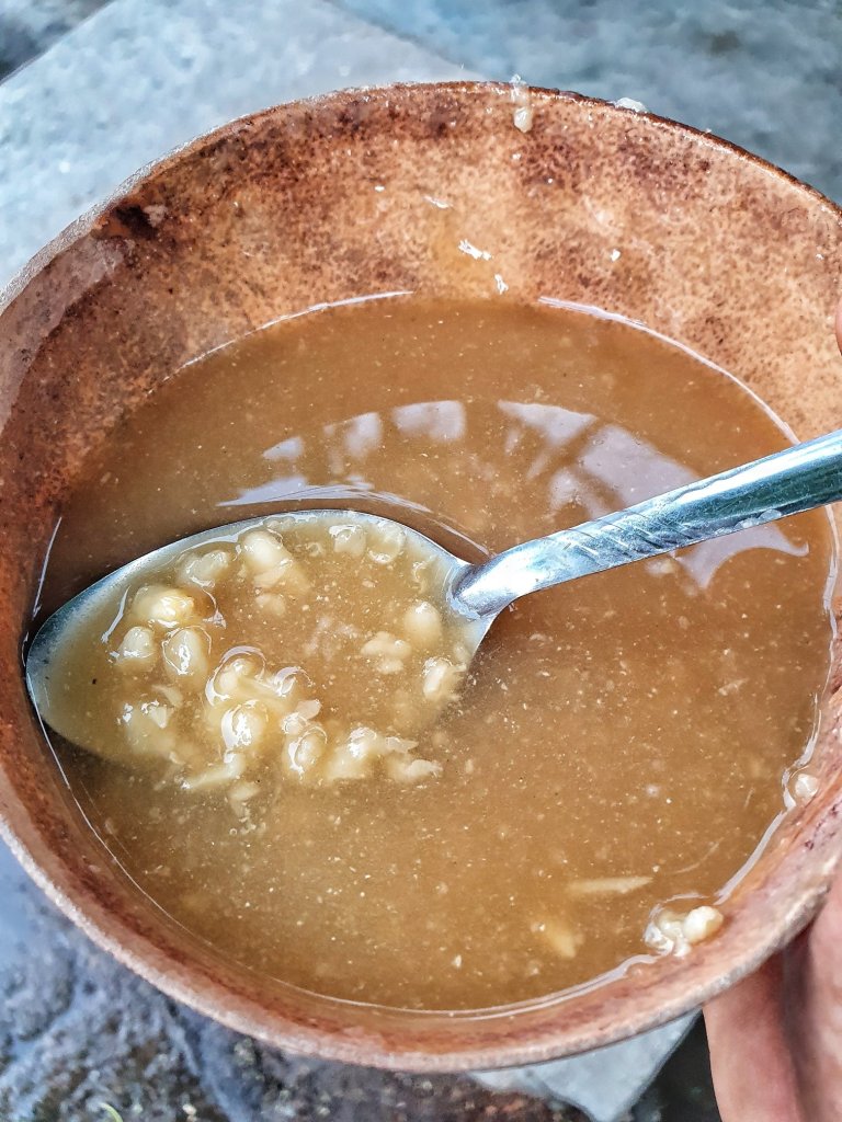 The second is to prepare the atole with fresh unfermented masa, cook the atole and leave it in a warm place until it ferments. The fermentation of either of the two methods can be from a few hours to three days, depending on the custom of the person who prepares it and the taste for its sour and acidic flavour. The level of fermentation depends on factors such as temperature, environment, fermentation time, and personal taste (how sour do you like it?). This sourness/acidity reminds me of pulque and its extremely short shelf life.