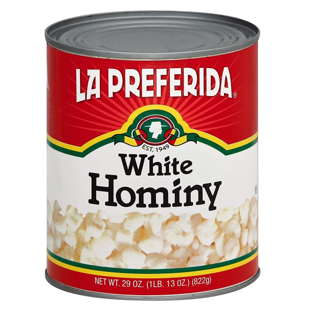 - In a litre and a half of chicken broth, boil the pre-cooked hominy corn for 60 minutes until the grains burst.