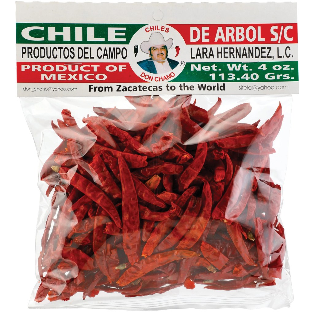 - 1/2 cup of dried chile de arbol/tree chili (a common Mexican chili pepper less hot than Cayenne)