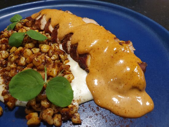 Pollo Asado con Salsa de Chimichurri Leones, Esquites y Puré de Papa.