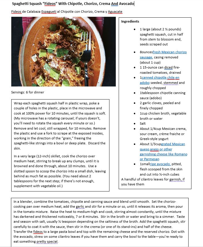 - https://www.rickbayless.com/recipe/spaghetti-squash-fideos-with-chipotle-chorizo-crema-and-avocado/