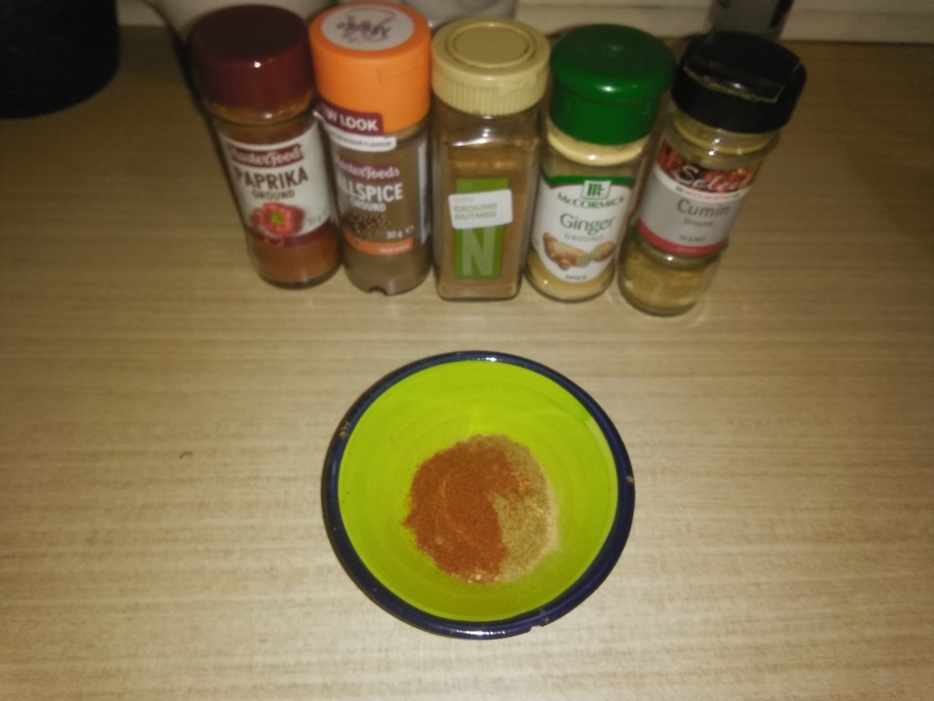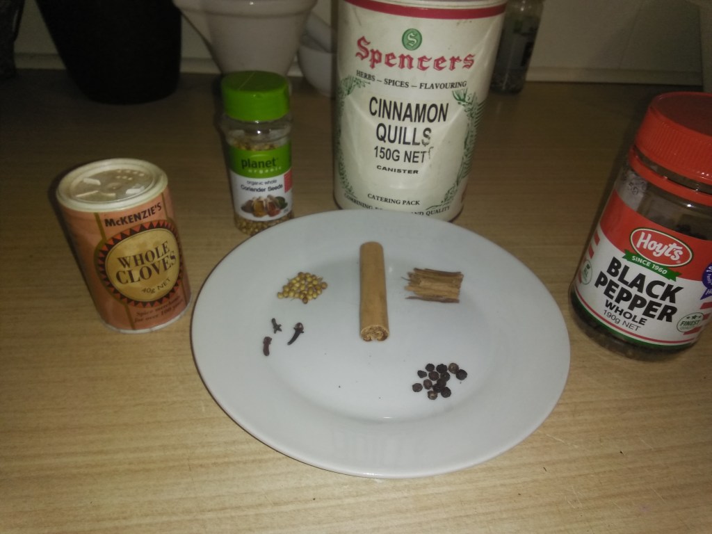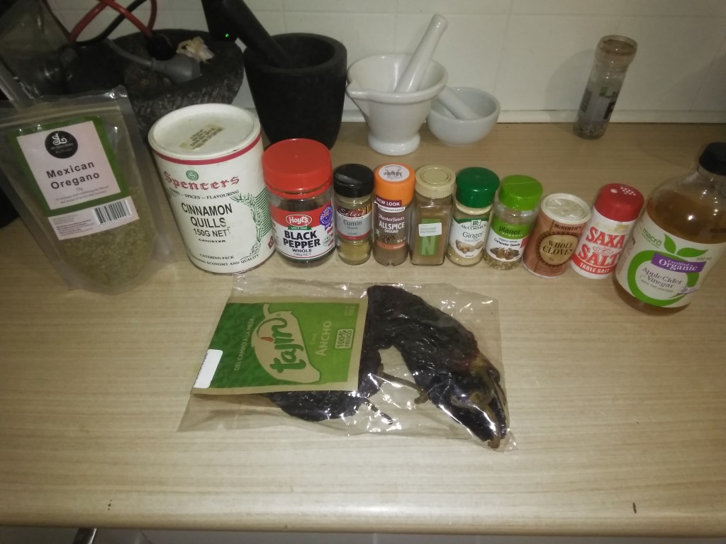 Some in my pantry were already ground so they were easy. I was also lucky in that I had ground ancho chile in my pantry as well. Some of the other spices were whole so I had to dry roast these in a pan and grind them myself.