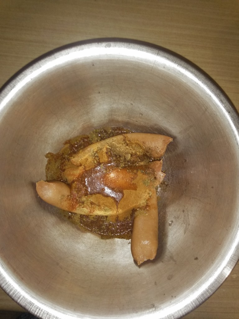First we remove the “meat” (1) from the casing. This sausage had an artificial skin (2) which is not unusual. Normal sausage skin can be quite delicate. Try making your own sausages and you’ll get what I mean.