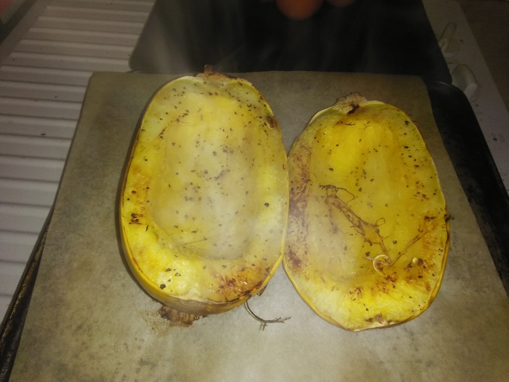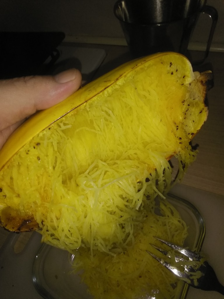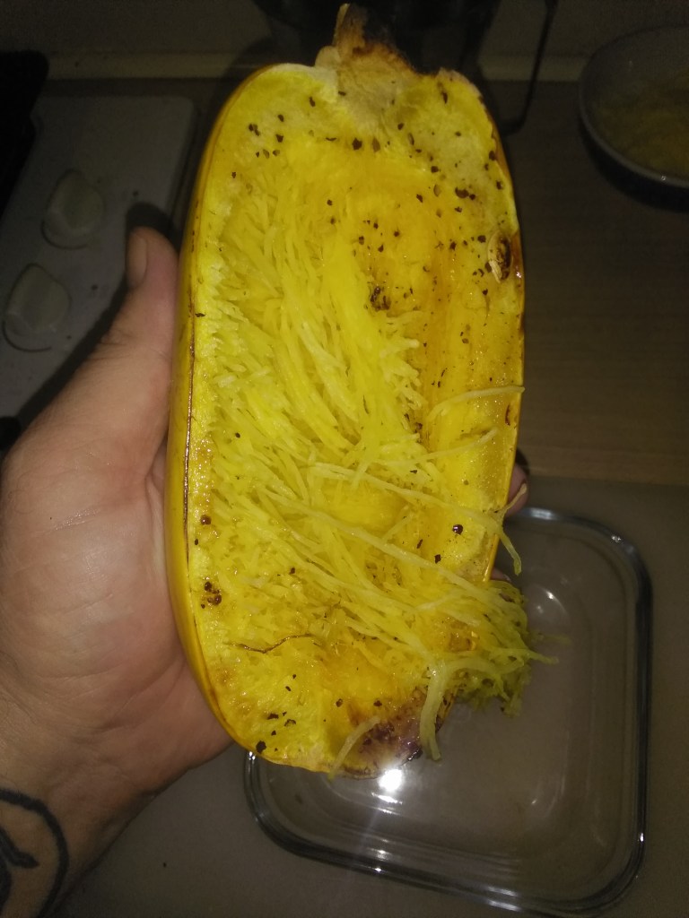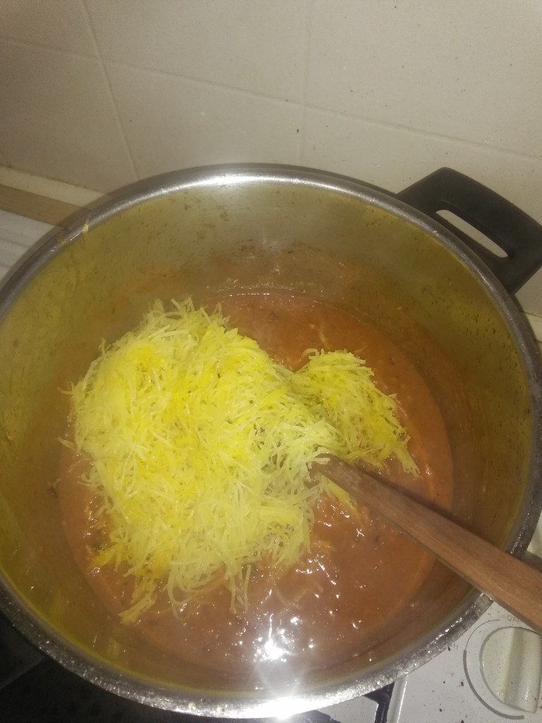 In this case the new ingredient was a spaghetti squash given to me by a work colleague who received it in an organic veggie box delivery and who had absolutely no idea what to do with it.