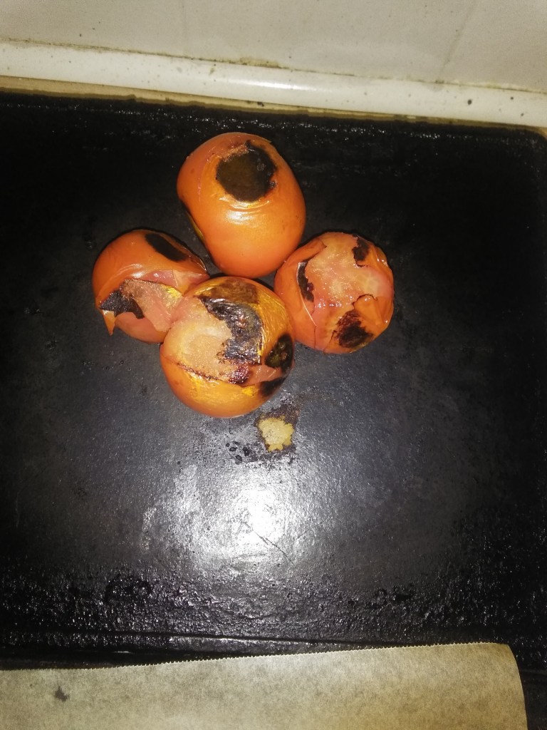 No canned, fire roasted tomatoes in my pantry so I’m substituting with 4 smallish tomatoes roasted on the comal and 1 Tablespoon of tomato paste diluted with 1/4 cup of water. Cooking vegetables this way (on a hot, dry – not oiled – comal/hotplate) is a process known as “tatemar”. This is a cooking procedure/skill that is vitally important to Mexican culinary practices and should be part of your repertoire of skills. I have a Post on this in the works.