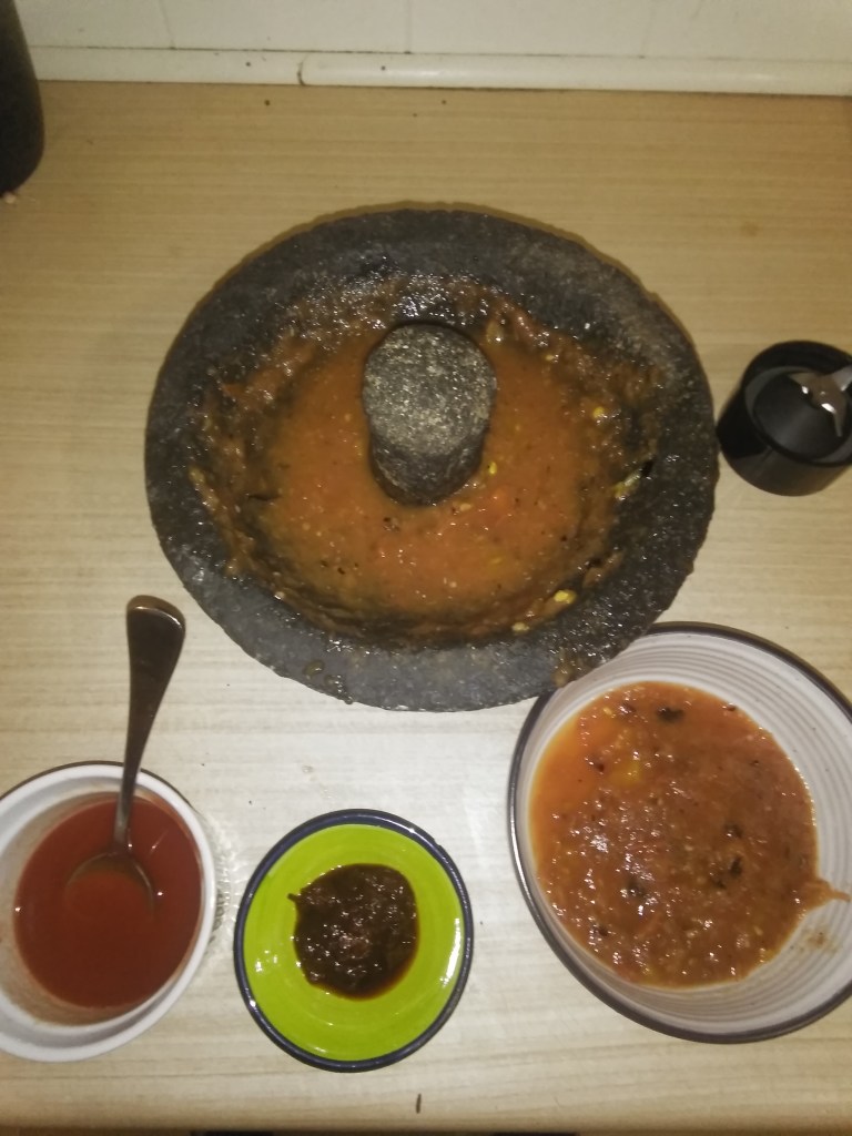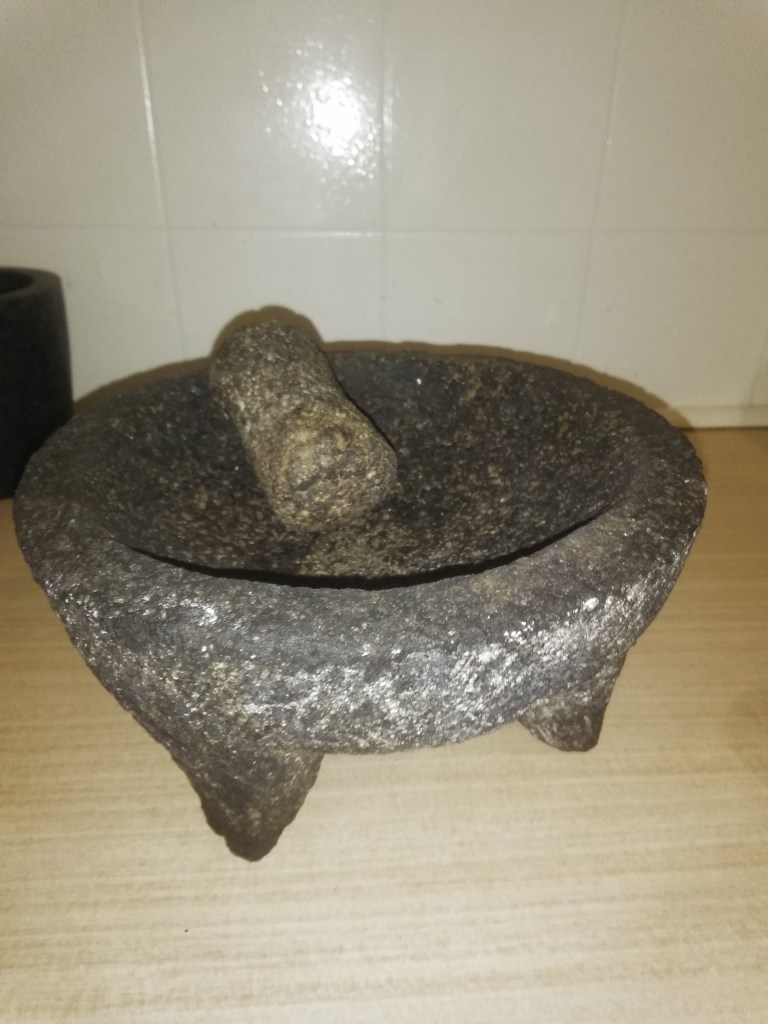 Out comes the molcajete. With my licuadora azteca I am able to grind my tomatoes (charred skin and all) into a paste that has a completely different texture to that of a blended tomato.