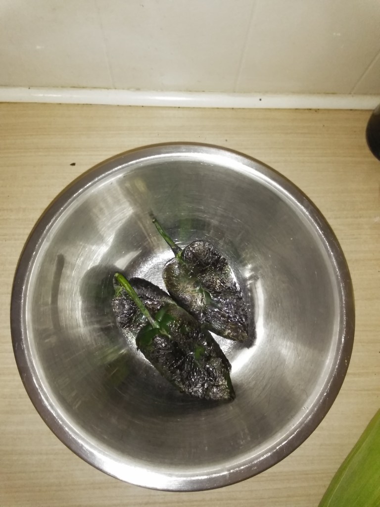 You are essentially burning the skin until it blisters. This will also cook the chile somewhat so don’t go too crazy. You just want the skin black and blistered as in the pic above.