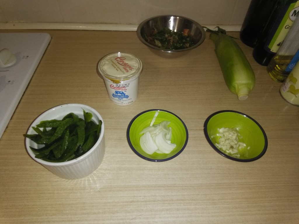 Mise en place complete (ignore the corn. Bloody photobombers). Time to cook