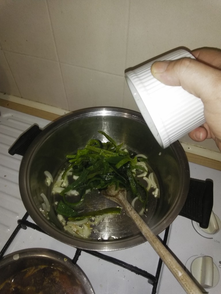 Over a medium-high heat. Onions first. Fry till fragrant. Garlic next. Then the rajas. You could stop the dish here and it would be complete.